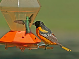 I was too slow to get the camera focused on the sapsucker and cardinals, but I did catch both the Baltimore and Orchard Orioles, and a few pugnacious hummingbirds.